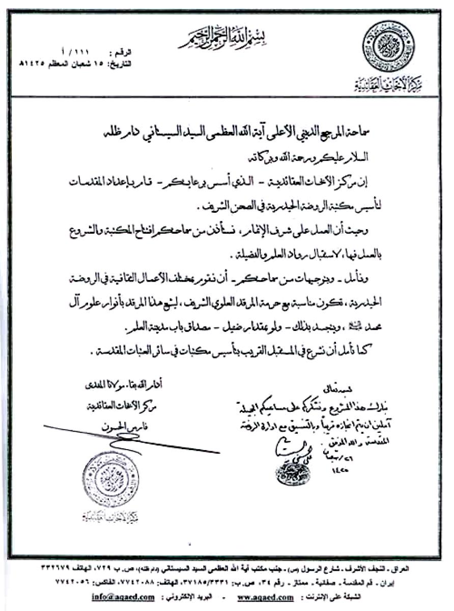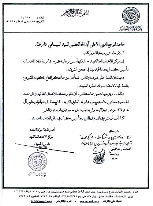 مباركة المرجعية العليا في النجف الاشرف بمناسبة افتتاح مكتبة الروضة الحيدرية
