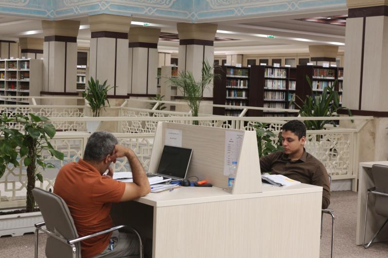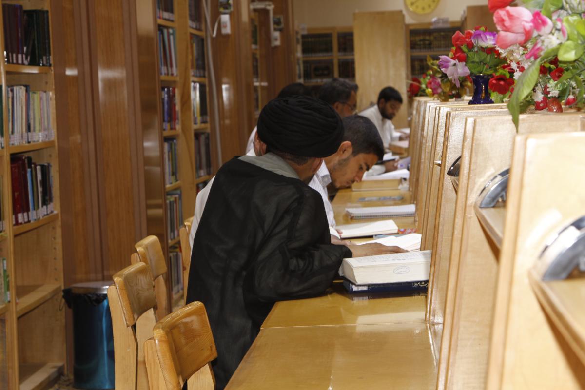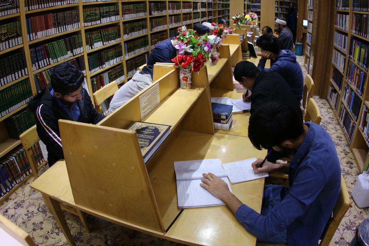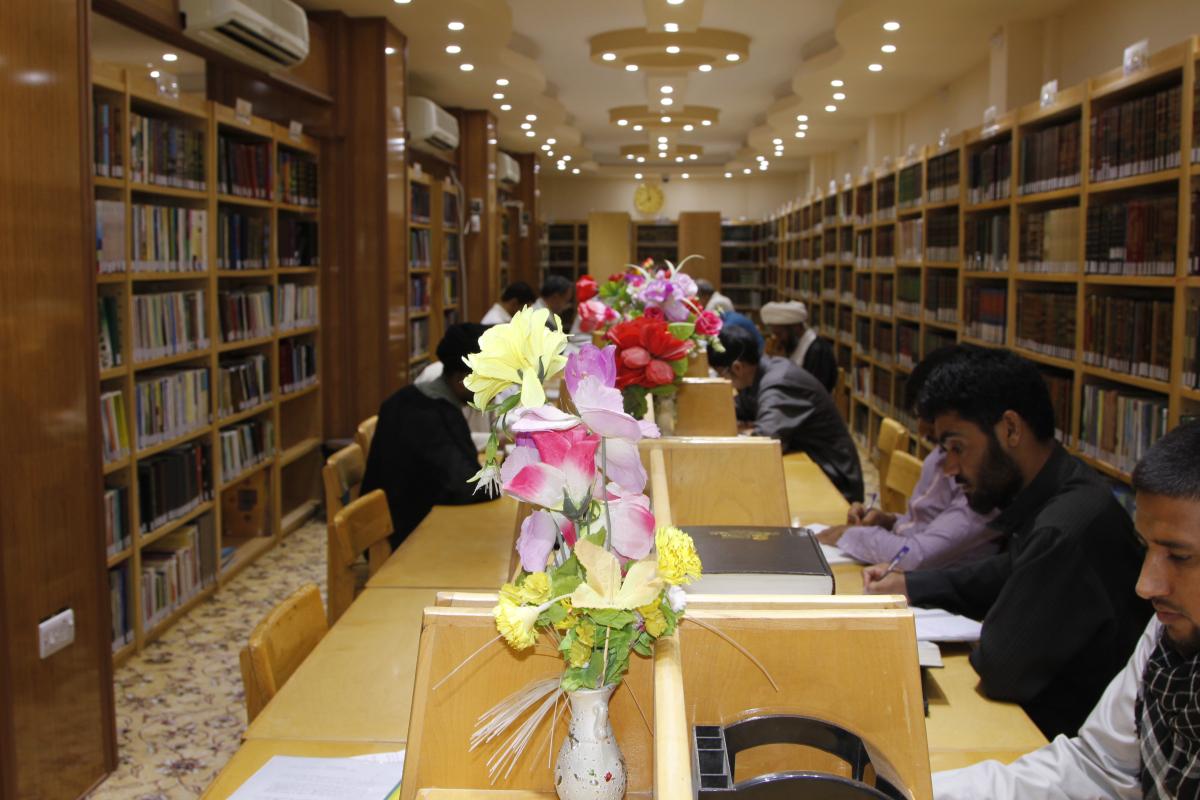وهي على نحو الرفوف المفتوحة، حيث يكون الكتاب أمام القارئ والباحث مباشرةً ممّا يساعد على سهولة البحث و الاطلاع على الكتب والمصادر الموجودة داخل القاعة - كما أن كتبها رُتِّبَت حسب التصنيف الموضوعي - كالتفسير والمباحث القرآنية، والحديث الشريف، والرجال والتراجم وغيرها من موضوعات المعرفة، علماً إنّ معظم كتب هذه القاعة هي باللغة العربية كما تشتمل على مجموعة من الكتب بالّلغات الأُخرى من قبيل اللغة الفارسية والاردو والانجليزية وغيرها، ويقدر عدد الكتب لكلا القاعتين (قاعة الرجال وقاعة النساء) في الوقت الحاضر (عام 1439 هـ 2018 م) بـ اكثر من (200 ألف) كتاب .